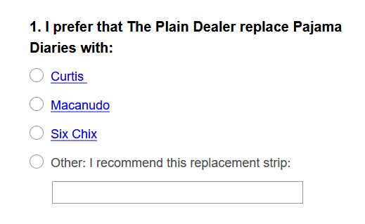 Terri’s home paper The Cleveland Plain Dealer, where we first learned of Terri’s plans, offered a comics poll a couple weeks ago. In the running there is Curtis, Macanudo, Six Chix, or the King Features strip of your choice.