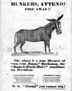 The donkey equals Democrats meme started with Andrew Jackson running for president. Wits of the era couldn’t resist the Jackson/jackass similarity. What they didn’t count on was Jackson embracing the idea. Soon cartoons of a jackass with Jackson’s face started appearing and continued throughout his two terms (1829-1837).