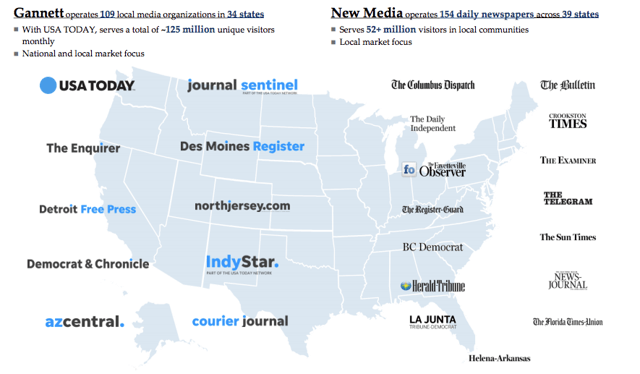 Given how many businesses in the newspaper industry have struggled with the transition from printed ad revenue to monetizing digital models, industry consolidation makes sense. The Gannett-New Media merger simply took consolidation to a massive scale. The newly formed entity will generate roughly $4 billion in annual revenues.