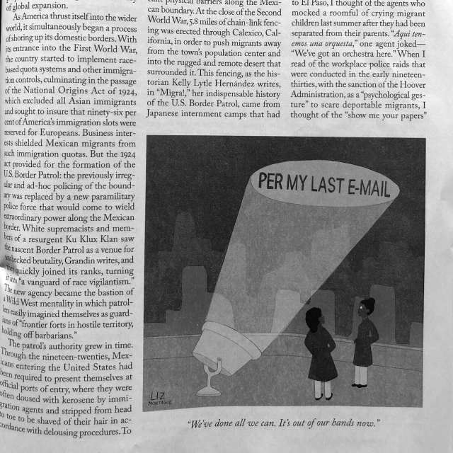 On Tuesday, she sends the New Yorker a cartoon and occasionally sketches one based on the news.