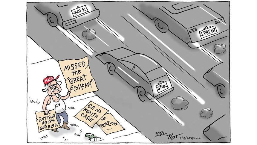 Joel Pett offers a hope that they’ll recognize the difference between Trump’s claim of a healthy economy and their own desperate efforts to stay afloat from paycheck to paycheck.