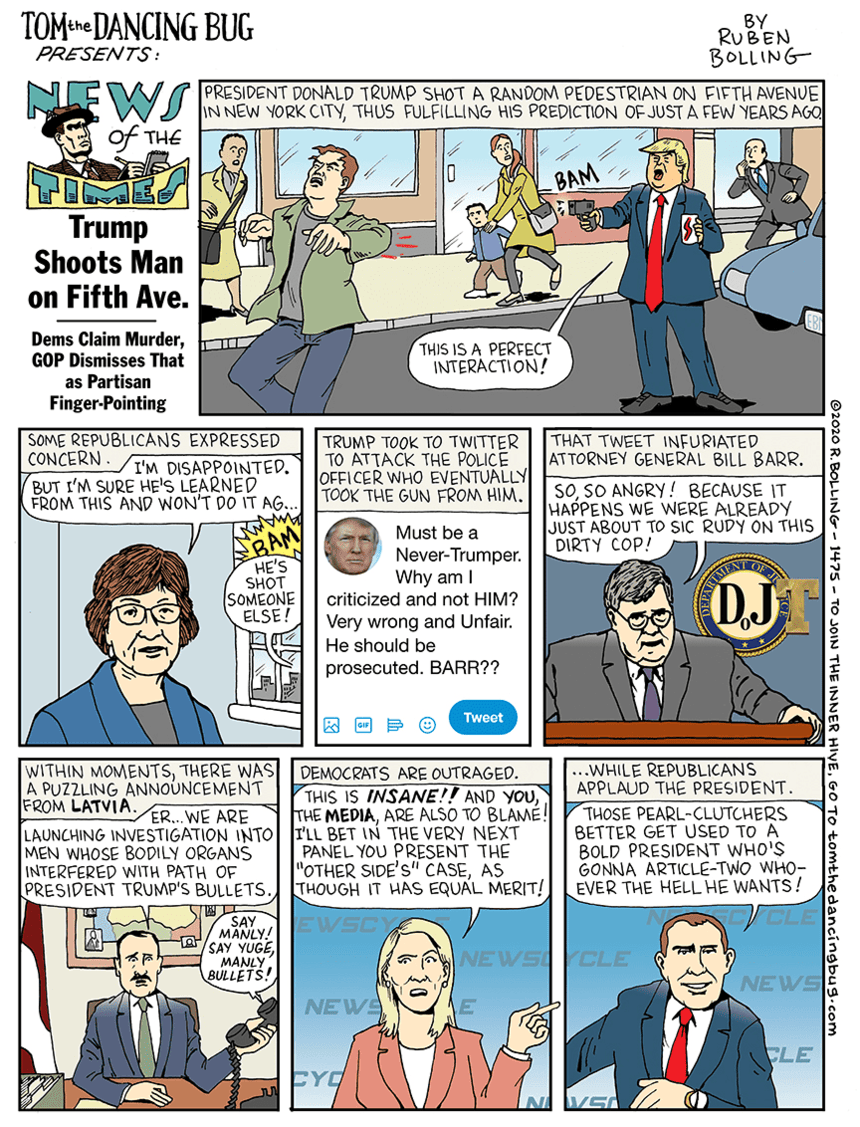 I mentioned recently that it’s hard to produce a multi-panel political cartoon that doesn’t include dubious filler-panels or drift off point entirely, but Tom the Dancing Bug nails the current state of things brilliantly.