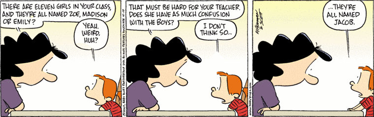 Which brings to mind this Baby Blues from 2007, which was about the time I gave up on names anyway, less because they were all the same but because parents had shifted to differentiating them by “creative spelling.”
