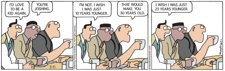 Pros and Cons offers some math problems as well as questions of age. Samuel wants to be a kid, but this is a fairly simplified version of “Mr. Green lives in a red house” puzzle, given that 10 years ago he was 30 and now he wants to be 23 years younger.