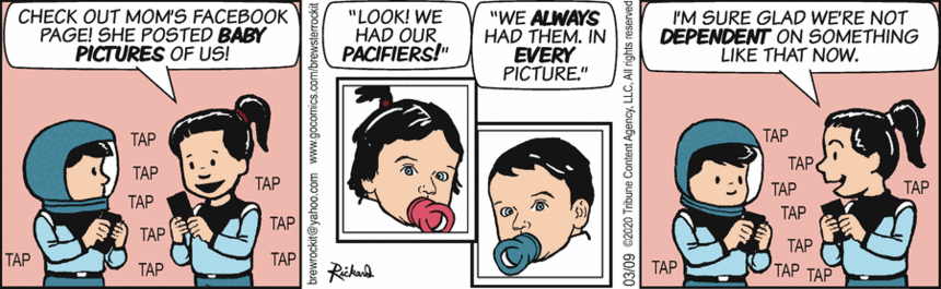 It’s hard to come up with a fresh “kids staring at their phones” gag, but Brewster Rockit cracked me up with this one, mostly, I think, because it carries forward into laughing at adults as well.