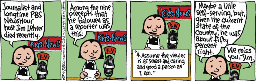 But, as Jim Lehrer and Cynthia say, you should assume you have an intelligent audience, and Wayno and Piraro not only make that assumption for Bizarro, but keep blog posts explaining their choices.