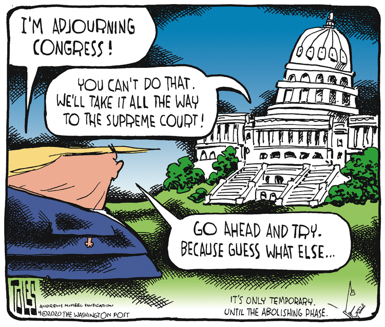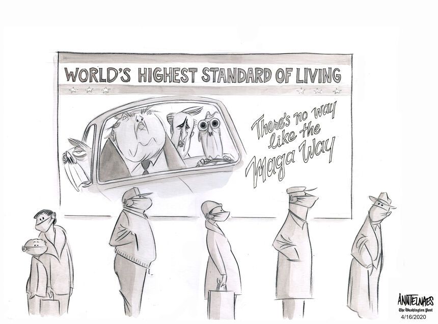 Telnaes turns it on its head, because, in her iteration, the people lined up could readily be in the car, except that they have been lied to and forced onto the street by powerful, dishonest, power-hungry men.