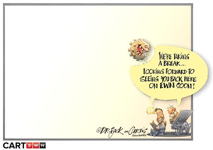Unsure why (unable to find any explanatory message) but after ten years,more or less, cartoonists Jack Swanepoel and John Curtis, better known by their partnership pen names Dr. Jack and Curtis, have decided to take a sabbatical from their Eyewitness News (EWN) cartooning in South Africa.