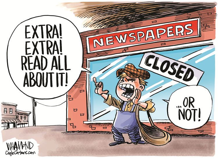 Journalism has been in decline for years, but the newspaper industry now faces sudden extinction with the pandemic as newspaper advertising revenue has crashed. A large percentage of our subscribing newspapers have simply stopped paying their bills; a good example is our local Santa Barbara News-Press that has run our cartoons and columns on their editorial page on most days for over 14 years – they are now seven months behind in their payments.