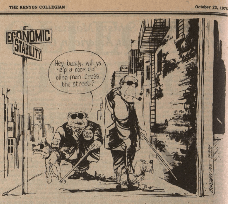 Borgman’s cartooning career began in the middle of his junior year, when Collegian writer Richard West ’76 asked him to illustrate a several- part series on famous Kenyon alumni. After that, Borgman asked Collegian editor Matthew Winkler ’77 P’13 H ’00 if he could begin drawing weekly cartoons, and Winkler agreed. One of Borgman’s first cartoons was in response to an incident during the summer of 1975, when a Campus Safety officer shot and killed a student’s cat. In the cartoon, Borgman depicted four felines as 1920s mobsters, complete with fedoras, tommy guns and zoot suits. By using Kenyon-specific events as inspiration, Borgman did more than political cartooning: He depicted student experiences through caricature.