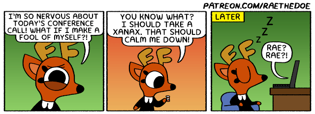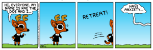 Rae the Doe is a comic about the life and times of a doe named Rae and her punk skunk girlfriend Mimi. There’s also her roommate, Pascal the Bat, her eccentric, trash-loving friends Cybil the Moth and Lottie the Opossum, and Sawyer the Squirrel, the voice of reason within the group. The comic is full of silly jokes, satire, and the occasional groan-worthy pun. The comic also touches on themes of LGBT acceptance and coping with anxiety and depression. Rae the Doe ran as an independent webcomic for two and half years before it was picked up by King for syndication.