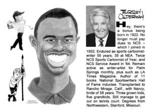 Murray Olderman profiled and drew sports cartoons of every major sports figure of the past 60 years, from Mickey Mantle to Joe Namath and Bear Bryant to Tiger Woods.For 35 years he was a syndicated columnist and cartoonist whose work was distributed by Newspaper Enterprise association to 650 daily newspapers. After serving as executive editor of NEA, he retired from the syndicate, but remained active as a writer and artist.