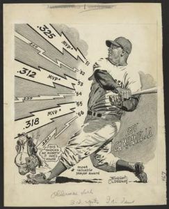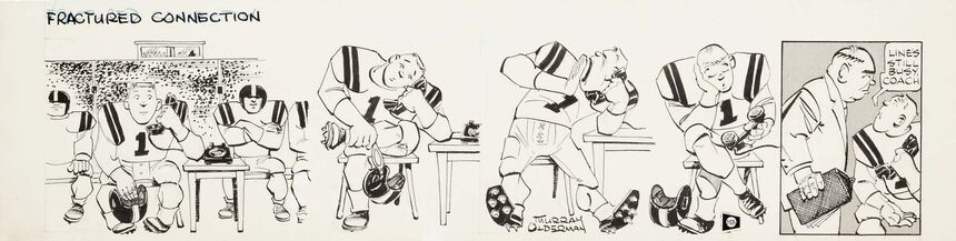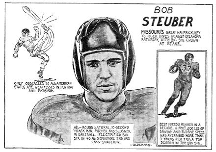Olderman’s professional career as a sports cartoonist and journalist began in 1947 after his time as an intelligence officer in World War II. He started off as a rookie in 1941, when he published his first illustration in the Columbia Missourian as a journalism student in his junior year at MU. The drawing depicted Bob Steuber, a halfback on the Missouri football team.