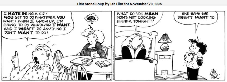 14. Sorry to hear you are retiring Stone Soup, but you deserve your R&R. Thank you for so many years of absolute enjoyment, truth among siblings and families, and HUMOR. Your comic was always the first one I read. Thank you from the bottom of my heart. Enjoy your retirement. ?