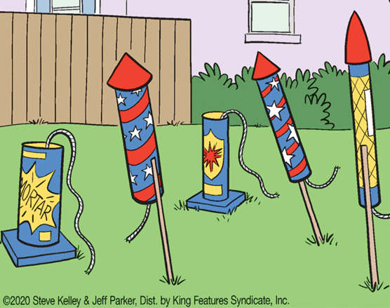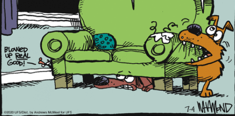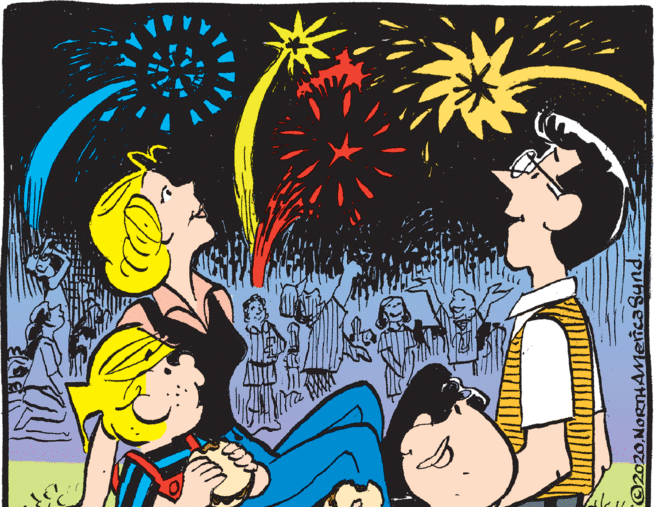 These days daily comics come with color so The Fourth landing on a Saturday doesn’t disallow for a red, white, and blue fireworks display. Dustin and Dennis did it.