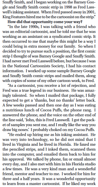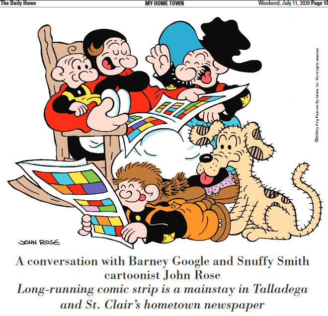 John Rose, cartoonist for King Features Barney Google And Snuffy Smith comic strip was recently interviewed by Buddy Roberts, the Special Projects Editor for Consolidated Publishing in Alabama. Roberts interviewed Rose for an article in the My Home Town section of The Daily Home newspaper in Talladega, Alabama.