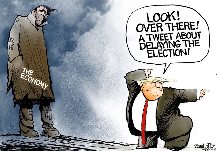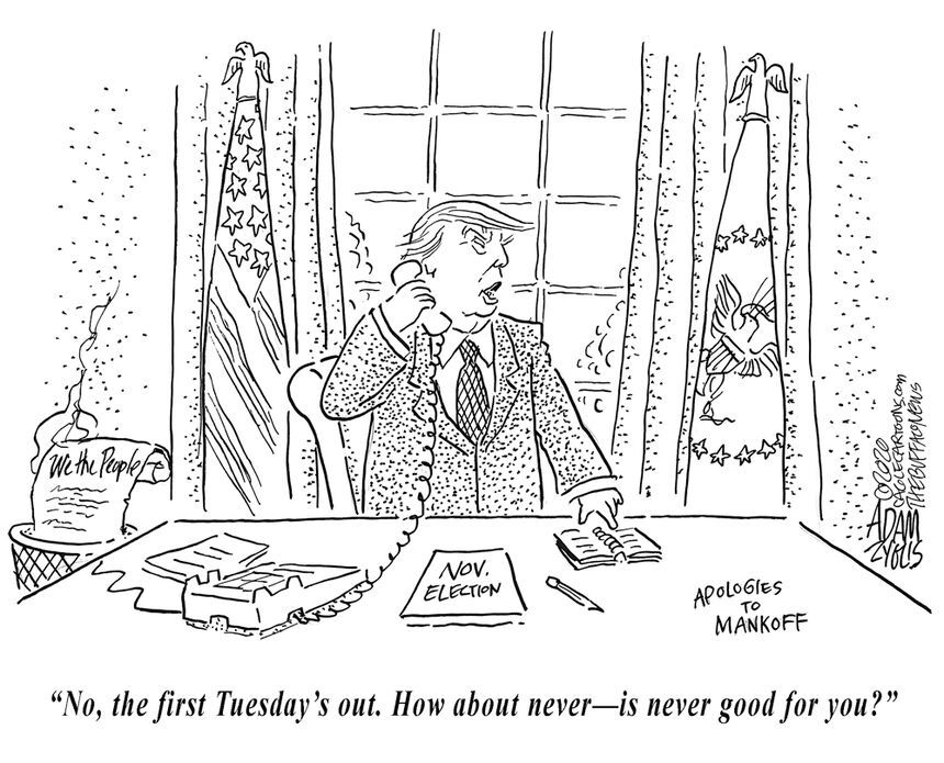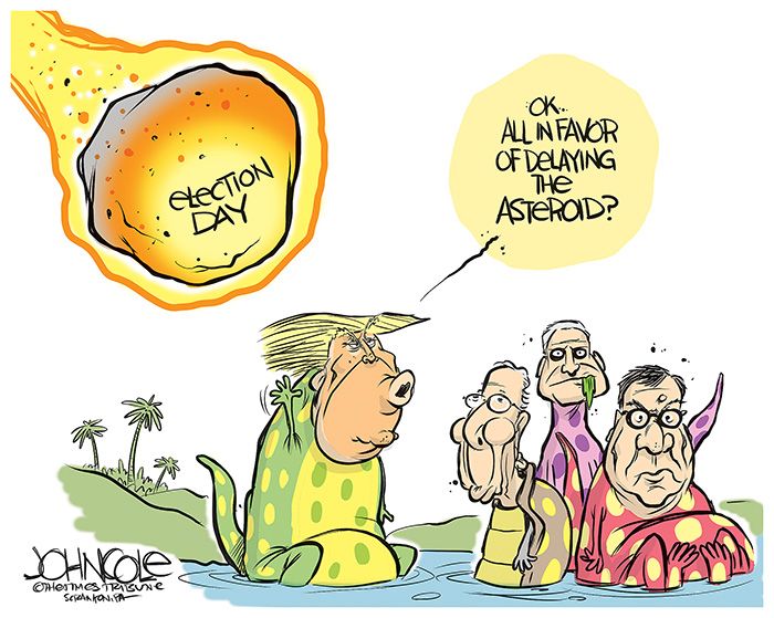 Zyglis riffs masterfully on a classic Bob Mankoff gag, indicating what Dear Leader would really prefer: Not a delay or a rescheduling of the election, but calling it off entirely.