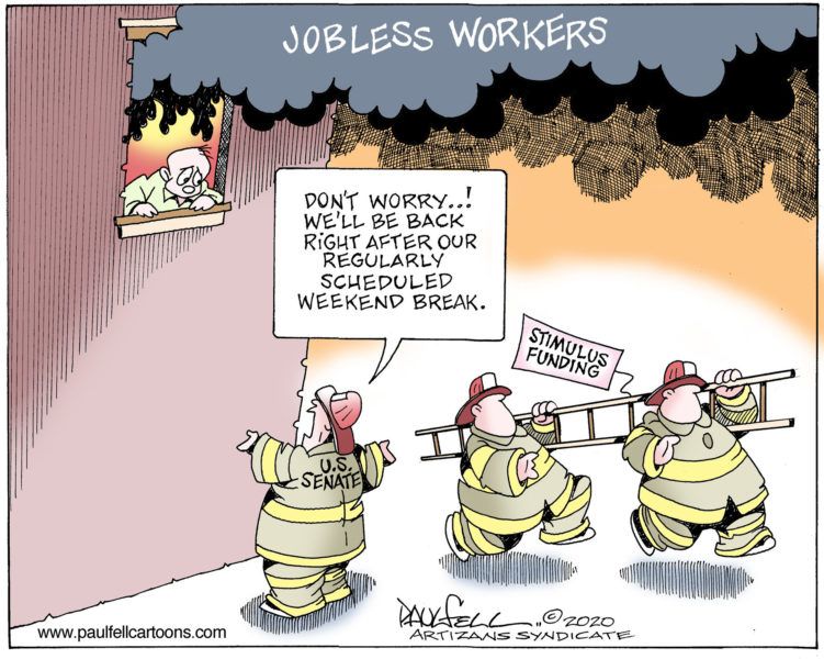 He didn’t go into details, such as the Democrats objecting to a provision limiting employers’ liability for allowing the spread of coronavirus in the workplace, and their belief that, if we could fit $680 million worth of fighter jets into the package, we could afford to give workers enough unemployment to feed their children and avoid eviction.
