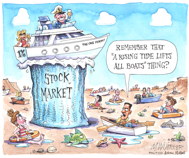 Matt Wuerker starts off today’s review of conspiracies with the widespread notion that the stock market is reflective of the overall economy.