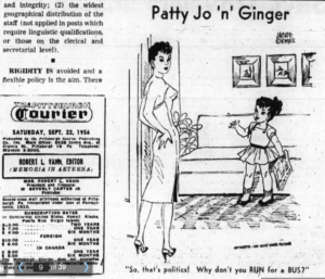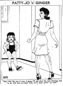 There doesn’t seem to be any real collection of Patty-Jo ‘n’ Ginger cartoons on the internet, but Goldstein’s book collects 88 (of 500+) panels with her commentary about the politics and fashions (Ginger and Patty-Jo both had extensive wardrobes) of the day running along side those cartoons.