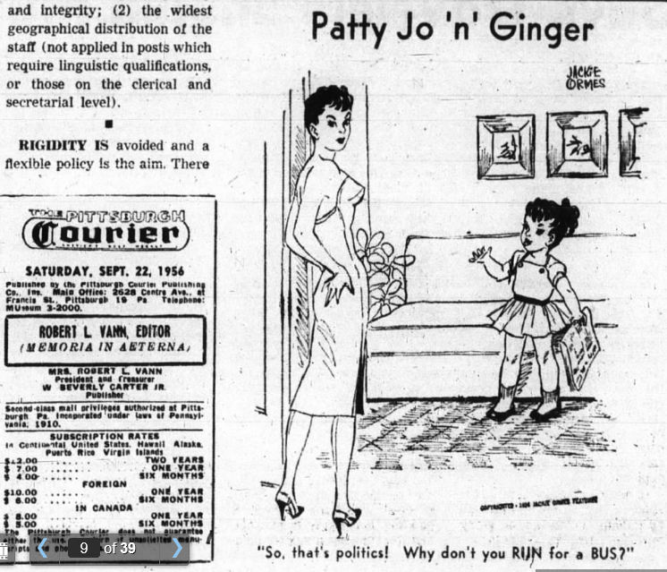 Skip to commentsMost comics historians, in writing about Jackie Ormes, note her Torchy Brown comic strip for which she is justly famous. But Ormes’ biographer Nancy Goldstein notes that “it is Patty-Jo that the readers of the Courier whom I talked to seem to remember most vividly.”