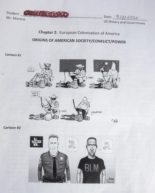 The cartoon, an attachment to a larger assignment promoting the Black Lives Matter movement, disturbed student Nicole Paternostro, who told the outlet that the cartoon was “disgusting.”