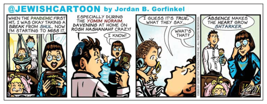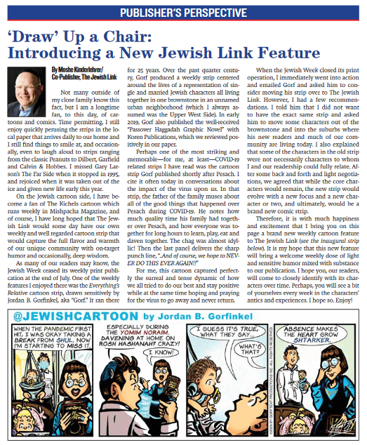 When the Jewish Week closed its print operation, I immediately went into action and emailed Gorf and asked him to consider moving his strip over to The Jewish Link. However, I had a few recommendations. I told him that I did not want to have the exact same strip and asked him to move some characters out of the brownstone and into the suburbs where his new readers and much of our community are living today. I also explained that some of the characters in the old strip were not necessarily characters to whom I and our readership could fully relate. After some back and forth and light negotiations, we agreed that while the core characters would remain, the new strip would evolve with a new focus and a new character or two, and ultimately, would be a brand new comic strip.