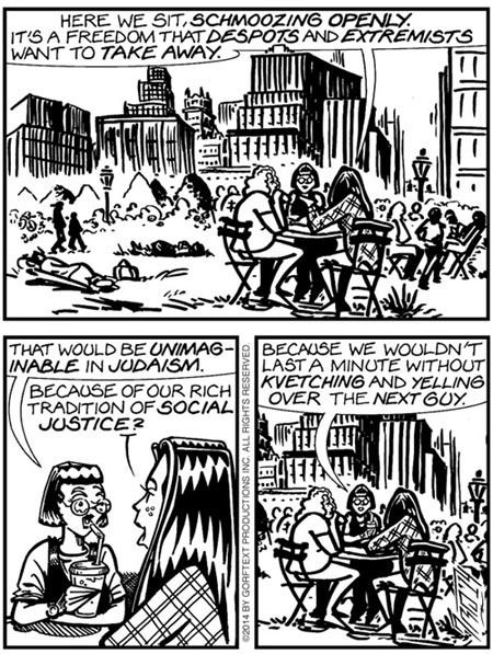 A look through some older strips shows a mix of religion, history, and old-fashioned Jewish culture humor – some in the Harry Hershfield style.