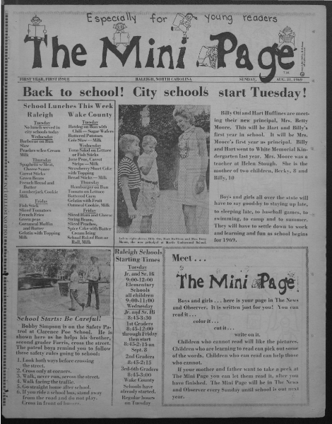 While teaching in Wake County, Betty had the idea of combining education and journalism into a newspaper for kids and approached The News & Observer about publishing it. She always gave special thanks to the late Dave Jones, associate publisher of the newspaper who as advertising manager gave her the chance to launch The Mini Page. The first edition was published in The News & Observer on Aug. 31, 1969.