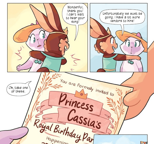 Farina faithfully adapted the Baby-Sitters Little Sister books, rendering the stories about family life in a curvy, manga-influenced drawing style. Song of the Court is very different. Pitched to readers aged 6 to 8, a relatively new category in the graphic novel world, the book features cute animals living in a fairy-tale kingdom, but the story gently touches on some difficult emotions.