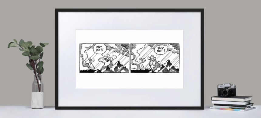 ‘But he wasn’t going to let that happen to me. So, he went to one of those Hallmark card stores and bought a rectangular frame with this cartoon in it. It shows Hagar the Horrible being blasted in a boat by a storm and he shouts up at the heavens, ‘Why me?’ And God replies, ‘Why not?’