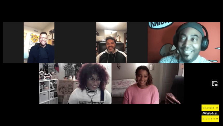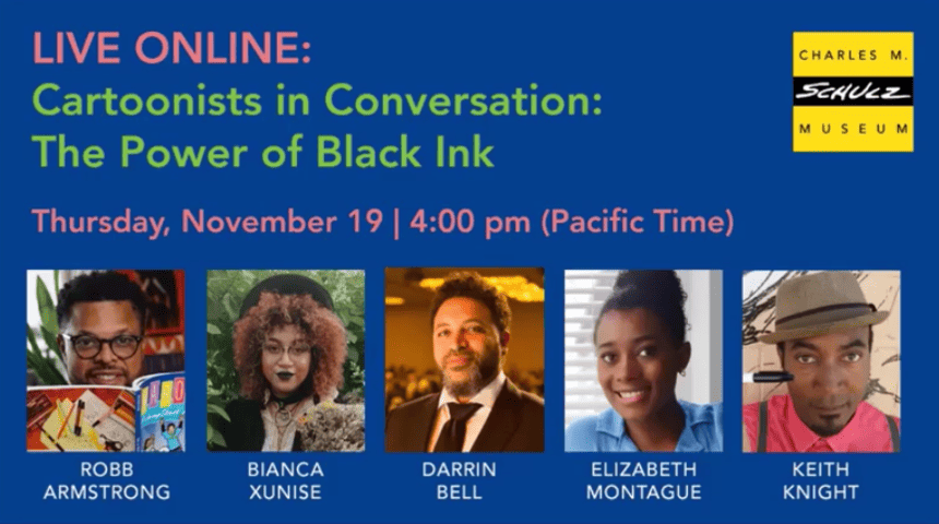 Join cartoonists Robb Armstrong,Darrin Bell,Keith “Keef” Knight,Elizabeth Montague, and Bianca Xunise as they discuss the Black experience as told through graphic novels and comic stories. Robb Armstrong, who inspired the last name of the Peanuts character Franklin Armstrong, is the creator of the groundbreaking comic strip, Jump Start, which celebrates its 30th anniversary this year. Darrin Bell is a Pulitzer Prize-winning editorial cartoonist and the creator of the comic strips Candorville and Rudy Park. Keith Knight is the creator of several popular comic strips, including The K Chronicles, and is the co-creator and inspiration for the new Hulu series Woke, based on his life. Elizabeth Montague is the creator of Liz at Large and the first Black female cartoonist for The New Yorker. Bianca Xunise is the first Black cartoonist to join the nationally syndicated daily comic strip, Six Chix.