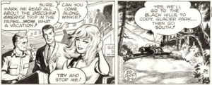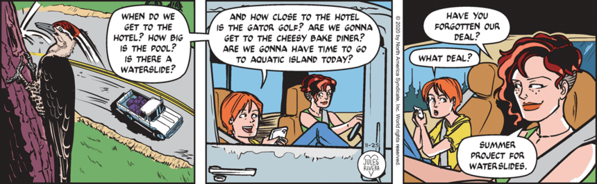 Peter Larsen, at the Daily Democrat talks to Jules Rivera about her new version of Mark Trail, where problems of the modern world (in work and nature) are coming to the forefront. That is not to say all traditions have been tossed – Mark and Cherry still love each other and nature is still canon. And, after a month and a half, the extraneous foreground creature that was ubiquitous in the Elrod strips returned today (see above) to huzzahs from the critics. But there are and will be changes: