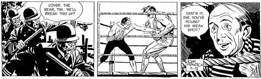 Oh, sorry! I seem to have accidentally posted a strip from the current Vintage Rip Kirby (KFS), in which dapper, gentlemanly Rip was forced into a bareknuckle brawl with a vulgar, blustering bully.