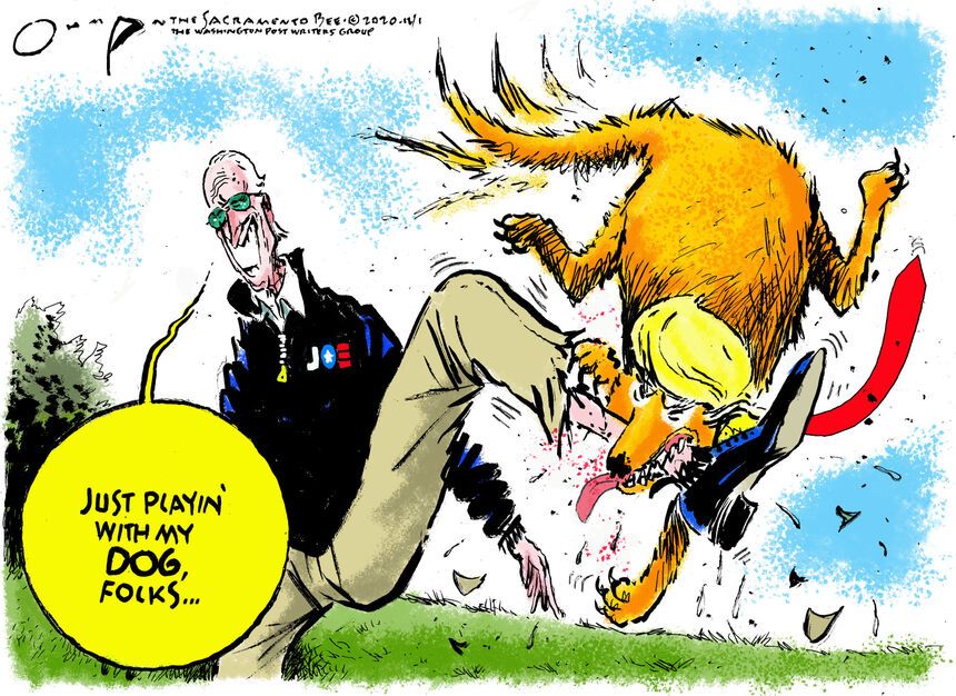 Jack Ohman (WPWG) capitalizes on the minor nature of the injury to take the opposite tack, showing a genial, smiling Biden not only fit but unperturbed, shrugging off the frenzied efforts of an unnamed dog with a shock of obviously fake blonde hair.