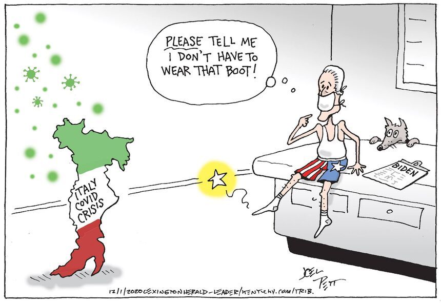Joel Pett (Lex HL) reaches into the bag of familiar symbols and emerges with an impressive fit, Italy having been one of the more hard-hit nations in the Covid crisis and that crisis being at the top of Biden’s aforementioned to-do list.