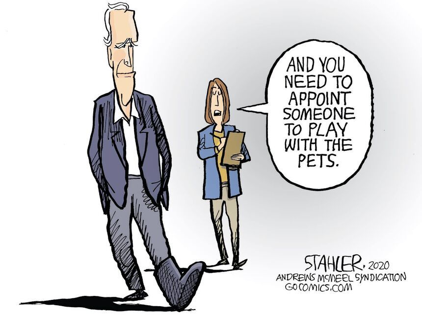 And also because we are all tired of cartoons of a crying baby in soiled diapers, so thank goodness the cartoonists have eagerly responded with fresh commentary, Jeff Stahler (AMS) offering the most straightforward piece, in which the boot adds to the list of appointments facing the incoming president.