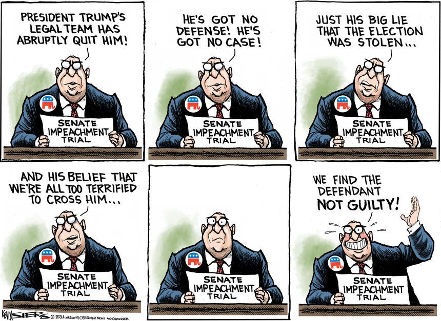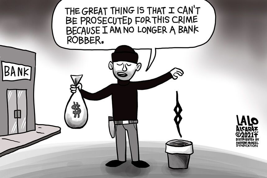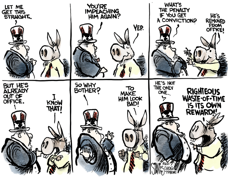 Lalo Alcaraz (AMS) points out the holes in the logic, and, besides, while impeachment is used to remove someone from office, it can be used to keep him from coming back.