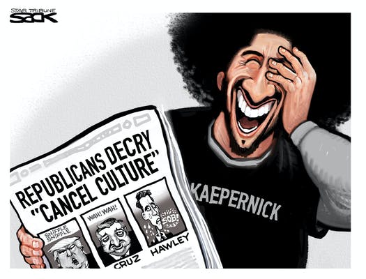 As Steve Sack (MplsST) notes, Republican whining over “Cancel Culture” should make us all laugh, though he only points out one victim of the phenomenon, not the Dixie Chix, Rob Rogers or David Horsey, and there are more.