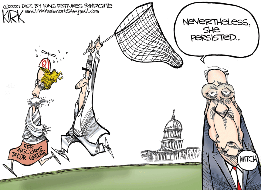 There’s a line to be drawn somewhere between political commentary and personal ridicule, and I think that, if Kirk Walters (KFS) had only shown Greene in the strait jacket, foaming at the mouth, it might be unfair.