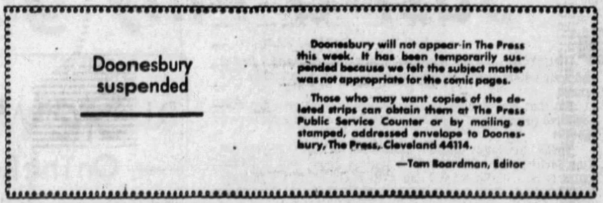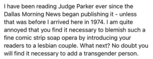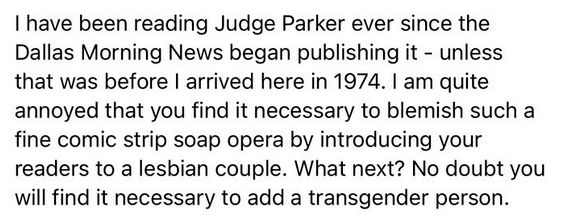 Around the time the outraged reader started reading Judge Parker he must not have seen that famous Doonesbury strip that introduced an openly gay character to newspaper readers almost fifty years ago.