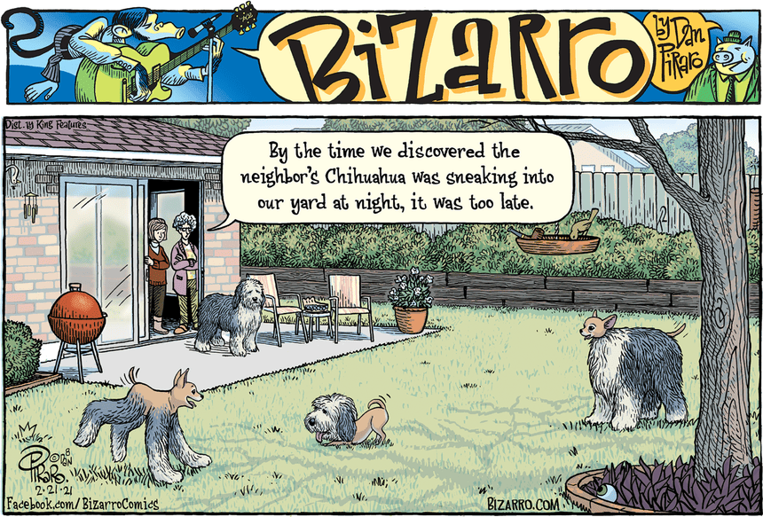For example, in his weekly taking-of-the-wheel at Bizarro (KFS), Dan Piraro touches on one of my pet peeves — see what I did there? — which is “Lady and the Tramp Syndrome,” a bit of genetic foolishness seen not just in that classic movie but also in “Turner and Hooch,” where it added bathos to what had been a touching ending to an enjoyable comedy.