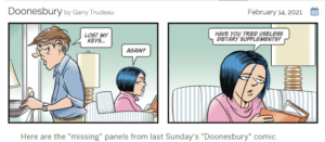 Why would The Oregonian cut the first two panels from the Feb. 14, 2021, “Doonesbury” comic? Is this a regular editorial practice?