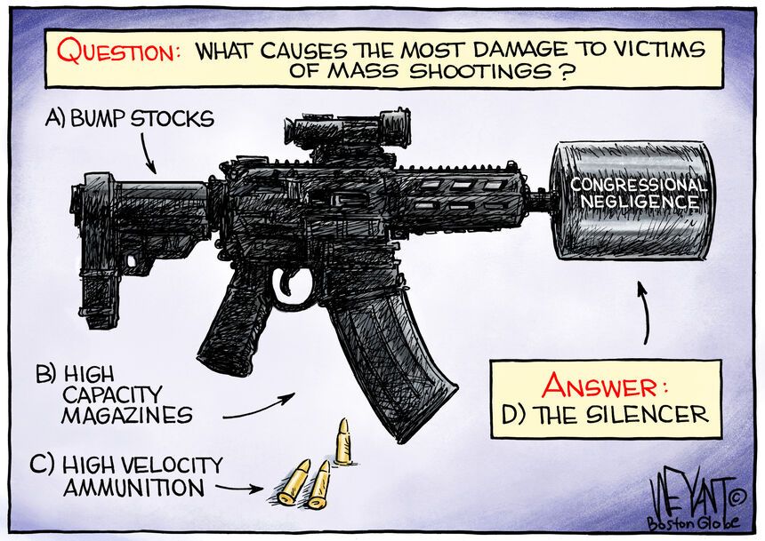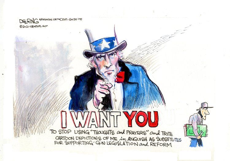 Which also applies to our attitude towards guns and mass murder, and John Deering (Creators) once more spares me having to lose my temper, because, yes, there were Weeping Uncle Sam cartoons yesterday, including a pair from the right side of the aisle, which seems not only useless but hypocritical.