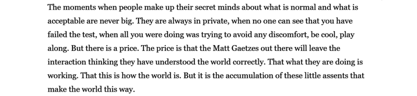 Among all decent people, male or female, for that matter, and I’m not sure I’ve heard the men’s code of honor laid out any better than Alexandra Petri, normally a humor columnist, lays it out in a Washington Post opinion piece, including this nugget of well-framed wisdom: