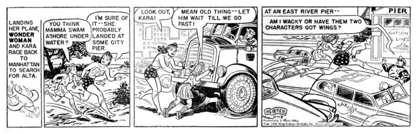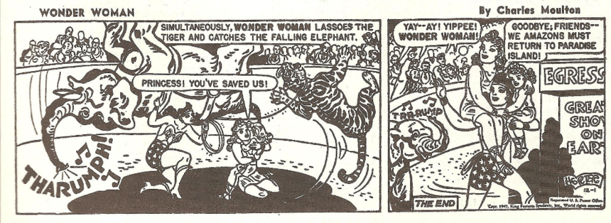 Those Marston-scripted comics were the Amazon’s own Wonder Woman comic book and comic strip. plus regular appearances in Sensation Comics and Comics Cavalcade. (Wonder Woman’s adventures in All-Star Comics, as part of The Justice Society of America, were written by others.)