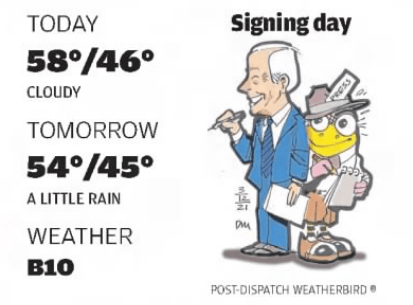 Skip to commentsEvery evening, just as many people are shutting down their computers for the day and starting to think about supper, Dan Martin is gearing up to complete his daily drawing for the St. Louis Post-Dispatch: a fresh depiction of the newspaper’s Weatherbird.