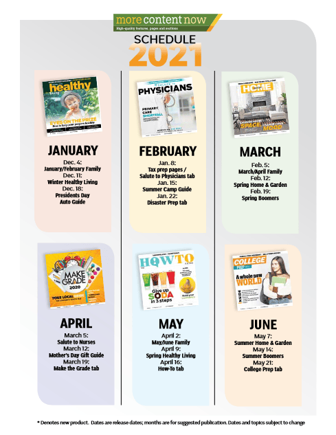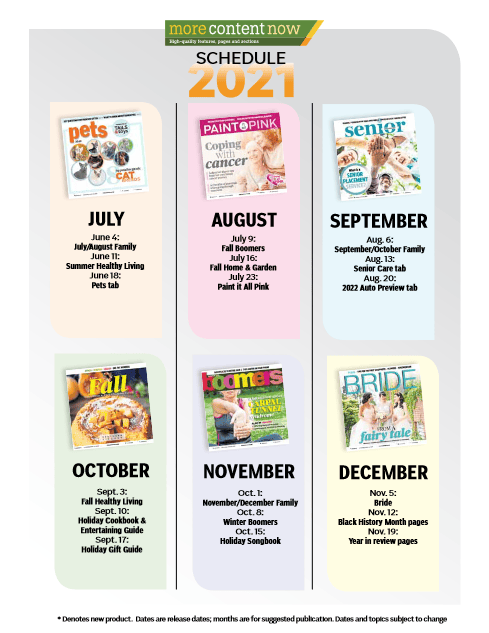 More Content Now, a part of Gannett, is a supplier of syndicated content, including high-quality Premium sections, special sections, a variety of ready-to-use weekly pages (health, food, travel, kids, etc.) and a variety of sports pages, including NASCAR, college and professional football and Major League Baseball.