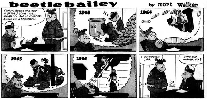 Beetle Bailey, by contrast, had started in 1950 and so was just about my age. Oddly enough, he still is.
