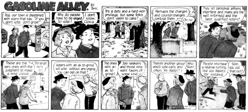 Gasoline Alley, by contrast, was more in, and for, my father’s generation. He was born close enough to the first appearance of the little foundling that his parents referred to him as Skeezix.